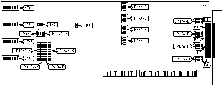 Note:JP12 sets the interrupt for port 1. The settings for JP13 through JP15 are identical and set the interrupts for ports 2 through 4, respectively.